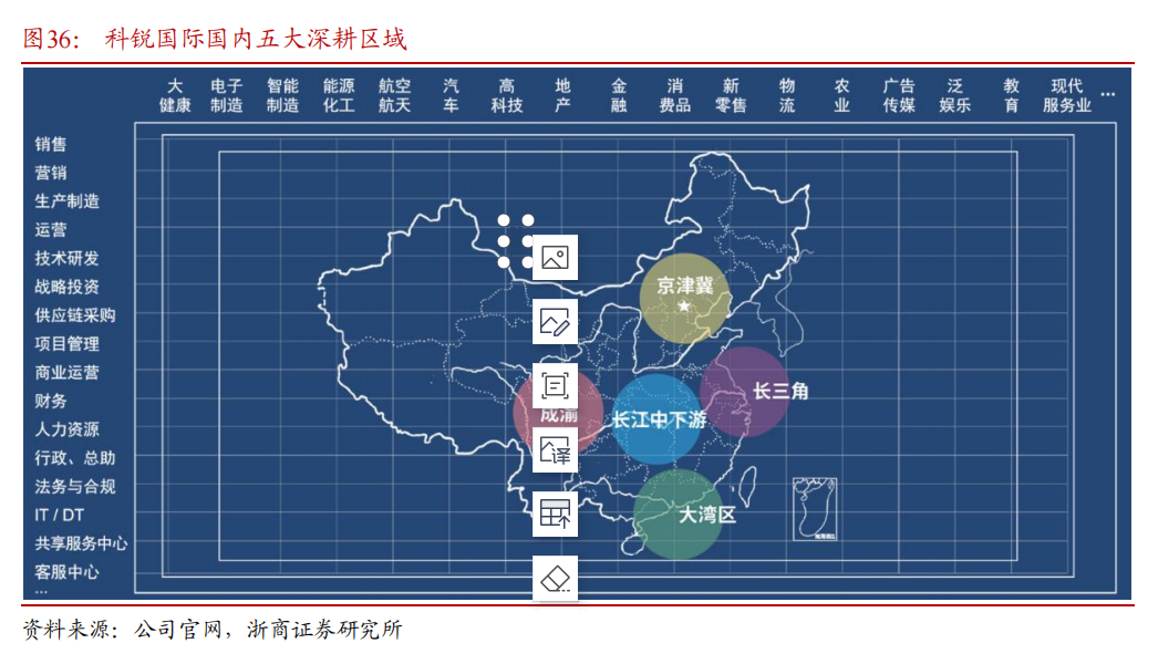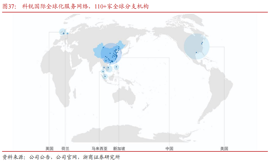 “一带一路”企业需求开启全球化人才配置,重视全球化服务体系建设。随着国内大客户国际化发展路径及海外子公司当地客户业务的扩张带来的人力资源需求,科锐亦积极推进海外布局,通过中国香港、东南亚、英国等地子公司多维度支持国内出海客户及海外本土企业各类人才服务需求。截至2022年底,公司海内外拥有 100 +家分支机构、超3,000 名专业招聘顾问及专业技术产研人员,业务覆盖中国大陆及中国香港地区、新加坡、马来西亚、英国、荷兰、美国等国家和地区,服务超过 20 个细分行业的研发、工程、制造、供应链、市场、销售、财务、法律、人事等多种职能职位,形成了 300 +个利润中心。