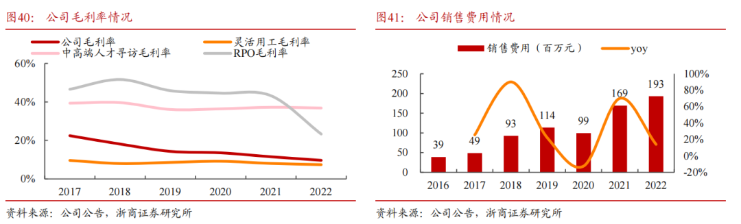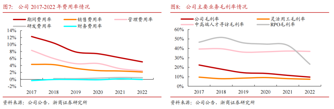 主营业务间毛利率差距较大,中高端猎头和RPO业务毛利率水平相对较高。而灵活用工业务收入中主要包含自有员工工资及服务费,自有员工工资计入公司营业成本,因此毛利率相对较低,灵活用工业务收入占比的不断提升,亦将对公司整体毛利率呈现一定影响。