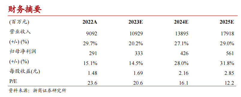 4)技术服务:数字化转型已成为公司核心战略,公司在科技产品及技术匹配端已完成前期布局投入,预计后续将为公司带来新增量,该部分业务体量相对较小,向上弹性可观,预计23/24/25年增速为+90%/+80%/+60%。
