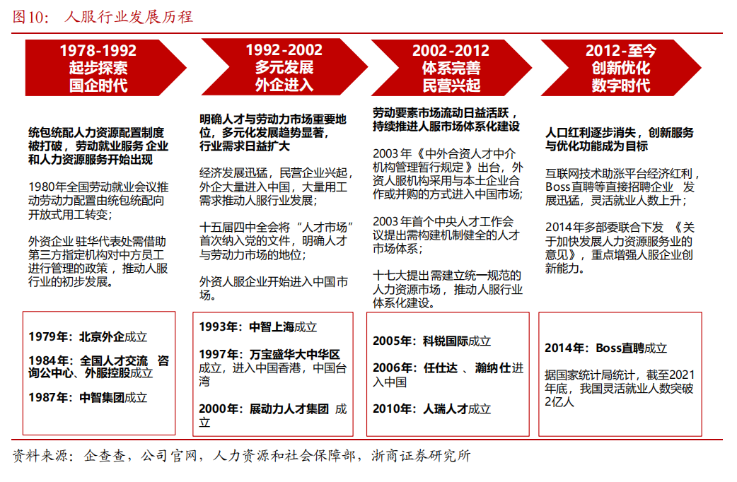 国企探索行业发展起步,外企民企助力体系完善,数字技术赋能创新服务与功能优化。我国人力资源服务行业经历了明确的四个阶段的发展,未来在行业体系持续健全及科技浪潮赋能加持下,行业市场化水平和企业精细化管理水平将进一步提升。
