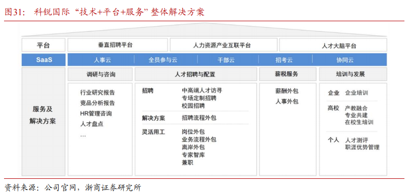 国内领先人力资源整体解决方案供应商,“技术+服务+平台”全产业链生态布局。科锐国际是国内首家A股上市的人力资源服务民营企业,以其基于技术驱动的整体人才解决方案服务领先业内,在超20个细分行业及领域为客户提供以高端人才寻访、招聘流程外包(RPO)和灵活用工三大领域为核心的人力资源全产业链服务,叠加公司技术服务平台端的一体化支撑,为引才就业与产才融合提供全链条赋能。