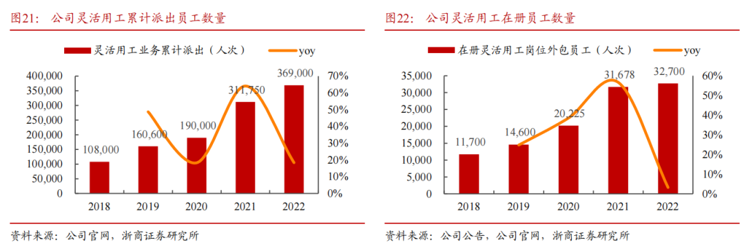 灵活用工持续高速增长,RPO贯彻大客户引领策略。灵活用工业务为公司收入贡献主力,且维持业务高速发展趋势,截至2022年底,公司灵活用工业务收入占比达88.39%,较19年提升近10 pct。此外,中高端人才寻访及招聘流程外包(RPO)业务继续深挖客户多维度服务需求,持续提升大客户黏性。2022年,公司成功推荐中高端管理人员和专业技术刚人员近2万人,灵活用工业务累计派出近36.9万人次,同比增长18.28%。