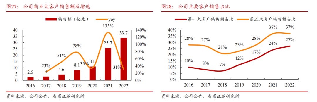 稳定聚焦KA大客户管理,第一大客户优势显著,前五大客户销售占比稳步提升。公司2022年实现前五大客户销售额33.7亿元,同比增速31%,2016-2022年CAGR达54%,2022年前五大客户销售占比依旧稳定在37%。