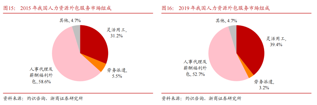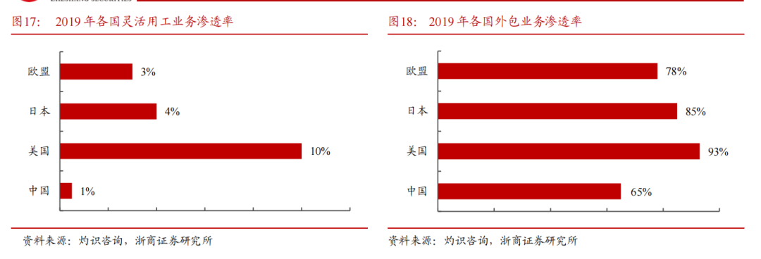 国内灵活用工服务市场渗透率对标海外发达国家具备较大提升空间。随着劳动力供需缺口维持高位、第三产业和新经济行业需求扩大,灵活用工成为广义外包服务市场的主要增长动力。据灼识咨询《2020年中国人力资源外包服务行业蓝皮书》,2015年灵活用工占总体外包规模的31.2%,2019年提升至39.4%。我国外包和灵活用工业务渗透率较海外发达国家较低,2019年中国/欧盟/日本/美国外包和灵活用工渗透率分别约为65%/78%/85%/93%和不到1%/3%/4%/10%。随着经济环境与发达国家趋同,企业间竞争加剧,在降本增效、减轻雇佣风险、满足短时用工需求的驱动下,外包和灵活用工市场规模仍有巨大提升空间。