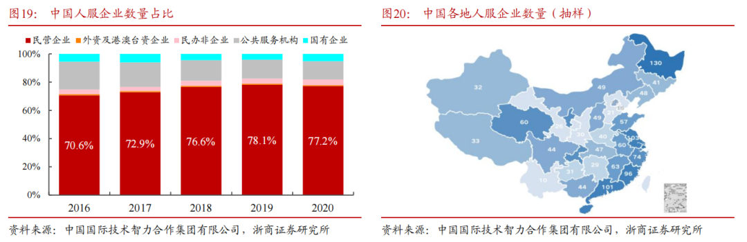 民营企业数量占行业绝对优势,企业发展具备区域生态属性,区域分布不均衡。由于人服行业技术壁垒较低,行业内众多小规模企业,民营企业数量占绝对优势,2020年民企/国企数量占比分别为77.2%/5.2%。此外,人力资源服务行业发展与地区经济水平相辅相成,业内企业多具备区域生态属性,深耕经济发达区域。据中智抽样数据,我国人服机构集中于经济发达、服务基础设施完善的沿海城市和内地一线城市,尤其是环渤海、长三角和珠三角地区,在国家鼓励劳动密集型产业园向中西部转移的趋势下,未来中西部地区人服企业或将获得结构性发展机遇。
