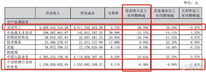 营业收入的增长系公司灵活用工业务增长所致。上半年,科锐国际灵活用工收入实现52.10亿元,占总营业收入的94%,同比上年增长18.70%。而中高端人才访寻业务、招聘流程外包业务、技术服务收入和其他业务收入分别同比-15.37%、-16.79%、9.05%、8.18%。
