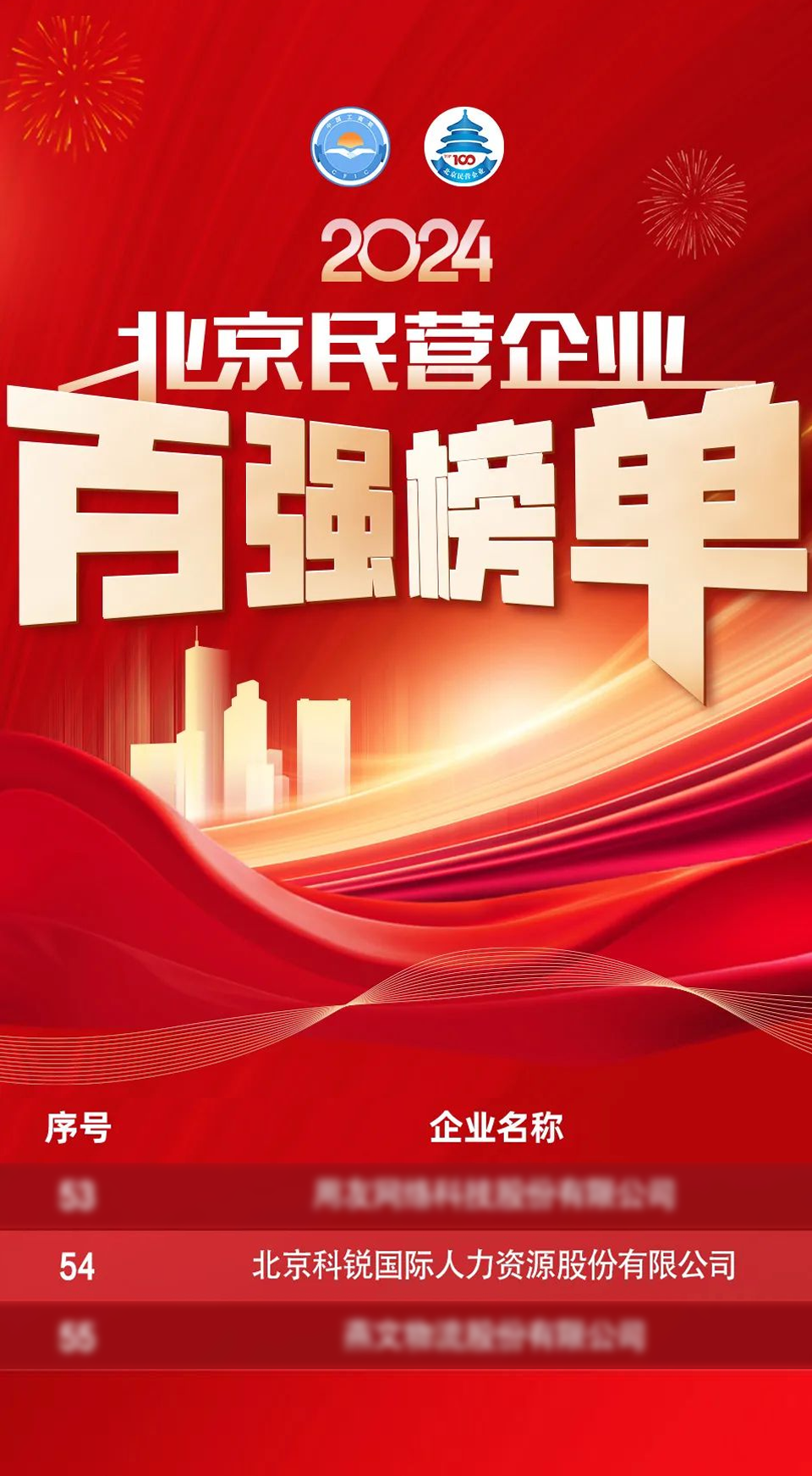9月26日,在中共北京市委统战部的指导下,北京市工商业联合会联合有关部门,发布了2024北京民营企业1+4百强榜单。科锐国际荣登“北京民营企业百强”(第54位),这也是科锐国际连续五年上榜百强,彰显出公司稳健的增长韧性与综合实力。