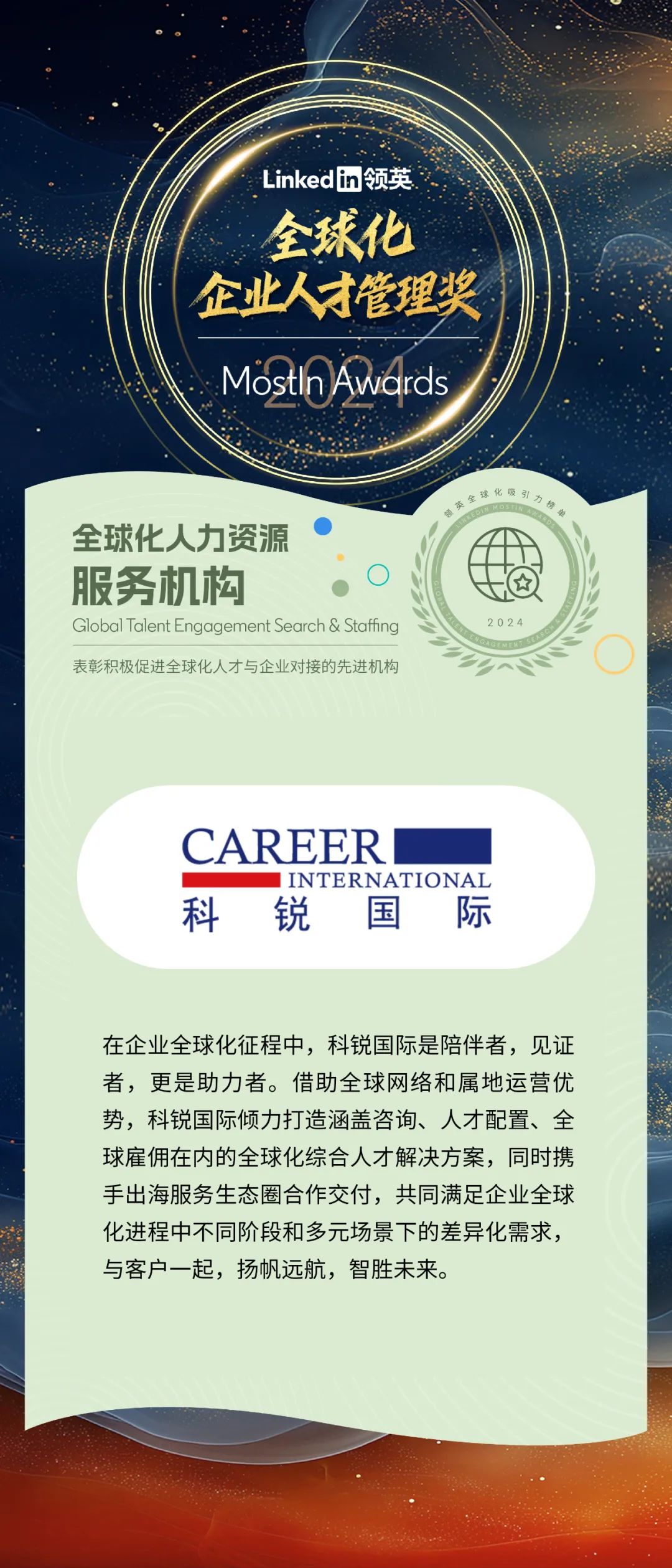 科锐国际是领先的以技术驱动的整体人才解决方案服务商,于2017年6月正式在深交所上市,成为国内首家登陆A股的人力资源服务企业(300662.SZ)。公司目前在中国、新加坡、马来西亚、美国、英国、德国、荷兰、澳大利亚等全球市场拥有100 余家分支机构,近3,000名自有员工。通过构建“技术+平台+服务”的商业模式,在20+个细分行业及领域为客户提供中高端人才访寻、招聘流程外包、灵活用工、人力资源咨询、培训与发展等人力资源全产业链服务,以及HR SaaS、垂直领域招聘平台、人力资源产业互联平台等技术和生态产品,为企业人才配置与业务发展提供一体化支撑,为区域引才就业与产才融合提供全链条赋能。过去一年中,公司链接企业近37,000家,贡献收入客户6,000余家,运营招聘岗位22万余个,成功推荐中高端管理及专业技术人员近20,000名,灵活用工累计派出人员38.3万余人次,聚合合作伙伴近13,000家。
