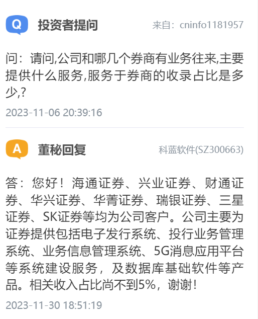 时隔多时,科蓝软件(300663.SZ)董事会秘书在11月30日盘后进行了回应,称公司客户包括海通证券、兴业证券、财通证券、华兴证券、华菁证券、瑞银证券、三星证券、SK证券等主要为证券提供包括电子发行系统、投行业务管理系统、业务信息管理系统、5G消息应用平台等系统建设服务,及数据库基础软件等产品。相关收入占比尚不到5%。