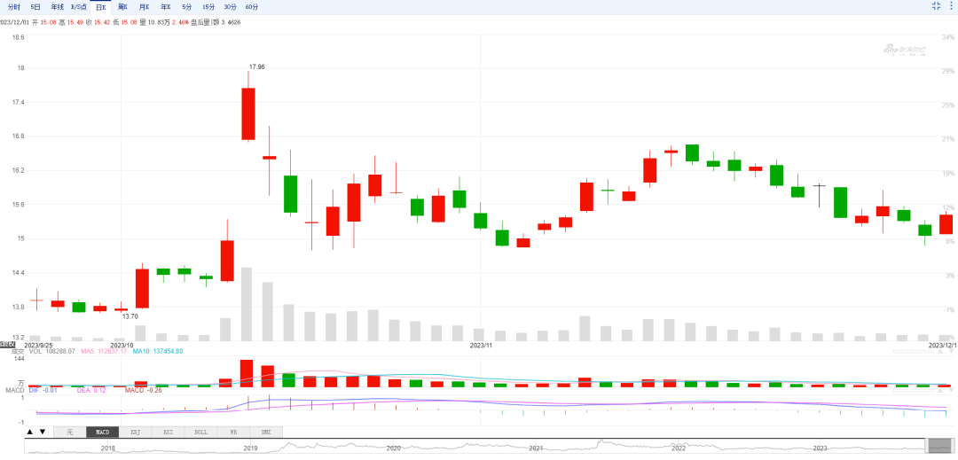 日K(前复权)显示,自10月17日创下近期高点后,科蓝软件震荡下跌多时,尤其是11月15日以来跌势明显;其中,11月30日下跌1.70%,收报15.05元/股。而在今天(12月1日)小幅高开,全天上涨2.46%,收报15.42元/股。