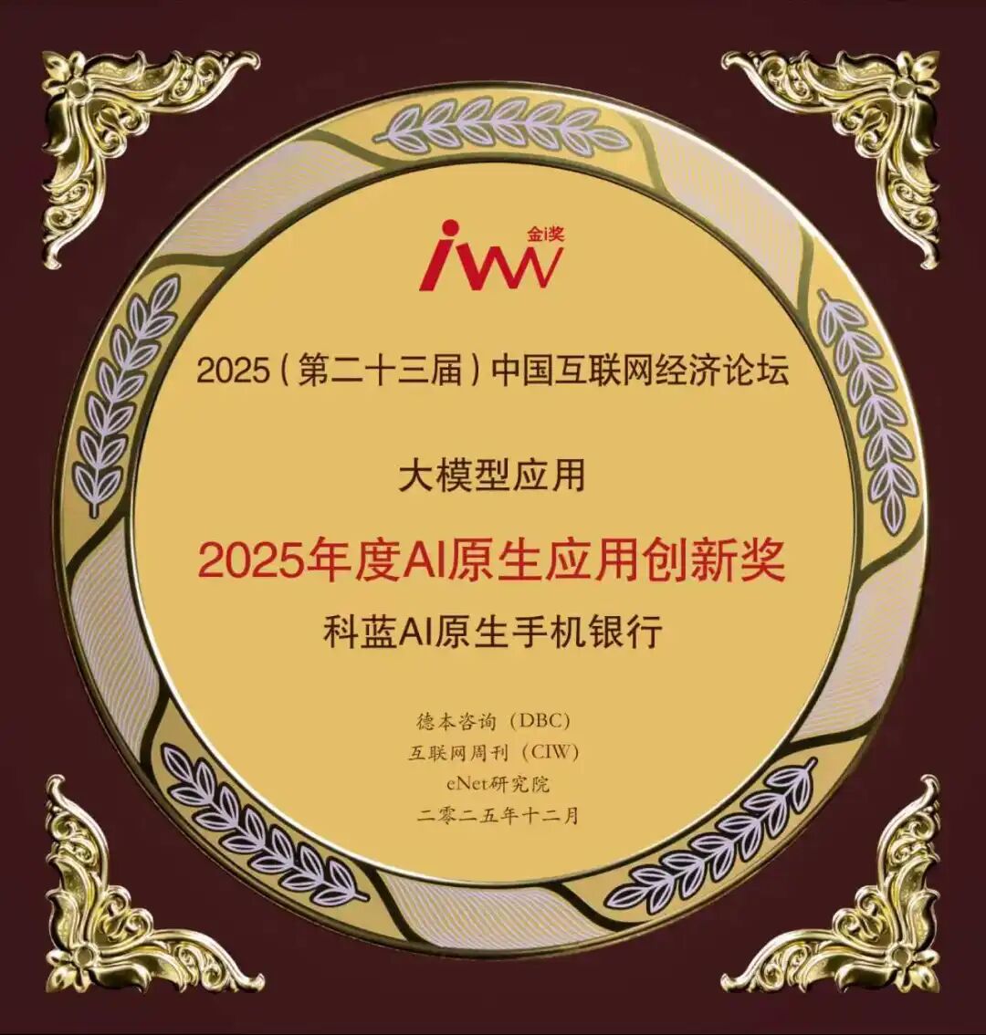 12月17日,由中国科学院《互联网周刊》、中国社会科学院信息化研究中心、eNet研究院、德本咨询联合主办的2025第二十三届中国互联网经济论坛“2025金i奖”榜单正式揭晓。凭借在大模型技术与金融服务深度融合领域的突出成果,科蓝软件AI原生手机银行成功摘得大模型应用领域“2025年度AI原生应用创新奖”,这一荣誉不仅是行业对科蓝软件技术实力的高度认可,更是其在金融信创与智能服务赛道持续深耕的有力见证。