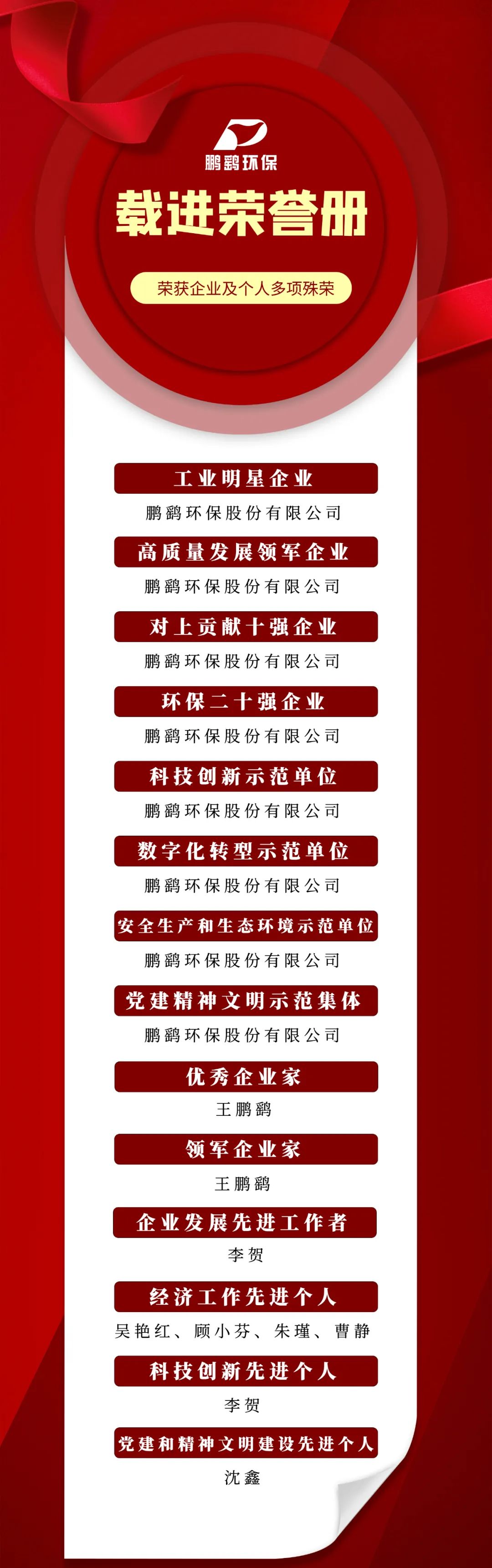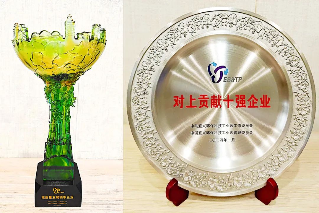 2023年,在市委市政府的领导下,鹏鹞环保凭借先进的经营理念、高效的管理模式和持续的技术创新,企业发展取得了一定的成绩,对宜兴的高质量发展、现代化建设发挥了重要作用。此次荣获工业明星企业、高质量发展领军企业、对上贡献十强企业等奖项,是市委市政府、环科园对我司在全市经济发展及行业发展作出突出贡献的肯定与鼓励。