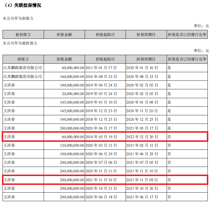 查阅鹏鹞环保2020-2022年年报可以发现,除去两笔的担保方是江苏鹏鹞集团有限公司以外,其余的担保方都是王洪春。
