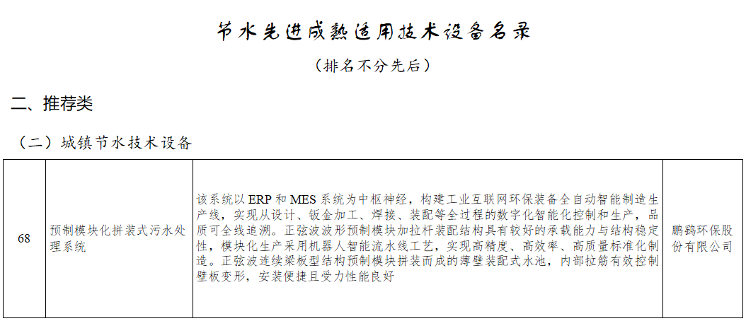 近日,全国节约用水办公室公布2025年度节水先进成熟适用技术设备推荐名录,鹏鹞环保自主研发的预制模块化拼装式污水处理系统成功入选推荐类城镇节水技术设备名单。这一成果标志着该系统的技术先进性与市场适用性获得国家级权威认可,也为鹏鹞环保在节水环保领域的创新实践注入新动力。
