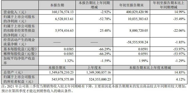 其中2021年第三季度,公司单季度主营收入1.6亿元,同比下降2.92%;单季度归母净利润652.8万元,同比下降52.78%;单季度扣非净利润597.44万元,同比下降38.63%;负债率64.01%,投资收益2.75万元,财务费用1298.61万元,毛利率23.28%。