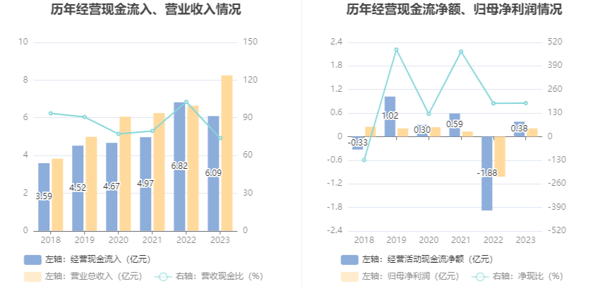 2023年,公司经营活动现金流净额为3824.73万元,同比增加2.26亿元;筹资活动现金流净额4270.55万元,同比减少1.71亿元;投资活动现金流净额-6902.56万元,上年同期为-9920.28万元。
