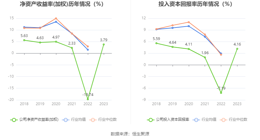 数据显示,2023年公司加权平均净资产收益率为3.79%,较上年同期增长23.53个百分点;公司2023年投入资本回报率为4.16%,较上年同期增长11.35个百分点。