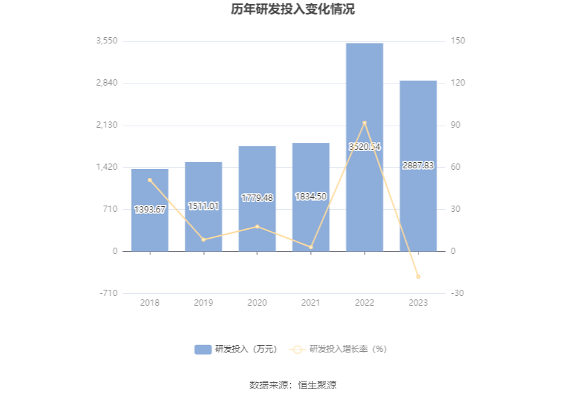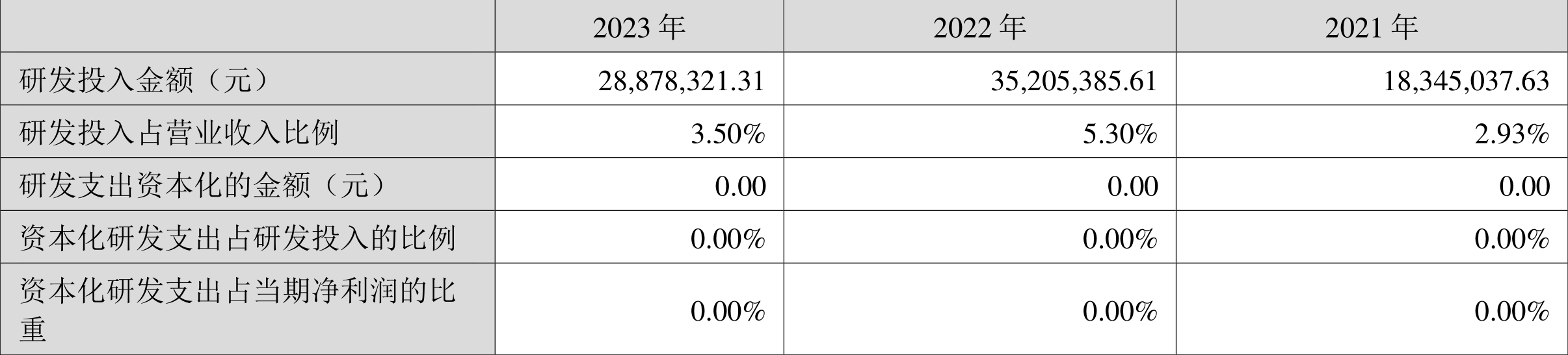 2023年全年,公司研发投入金额为2887.83万元,同比下降17.97%;研发投入占营业收入比例为3.50%,相比上年同期下降1.80个百分点。此外,公司全年研发投入资本化率为0。