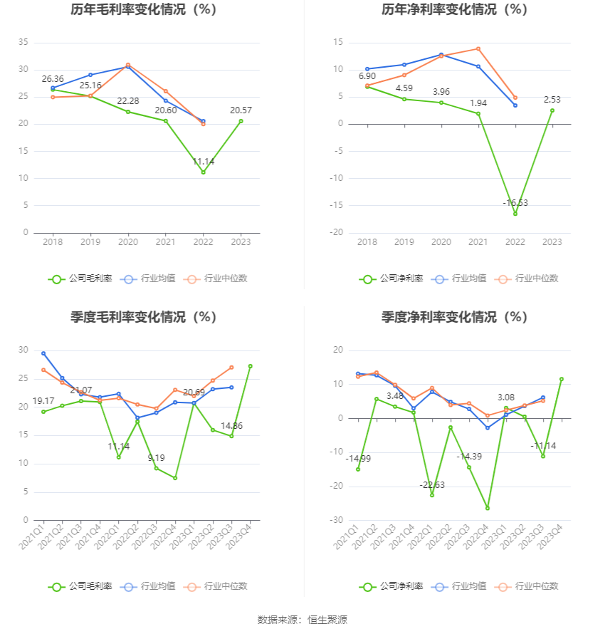 2023年,公司毛利率为20.57%,同比上升9.43个百分点;净利率为2.53%,较上年同期上升19.06个百分点。从单季度指标来看,2023年第四季度公司毛利率为27.23%,同比上升19.77个百分点,环比上升12.37个百分点;净利率为11.58%,较上年同期上升38.01个百分点,较上一季度上升22.72个百分点