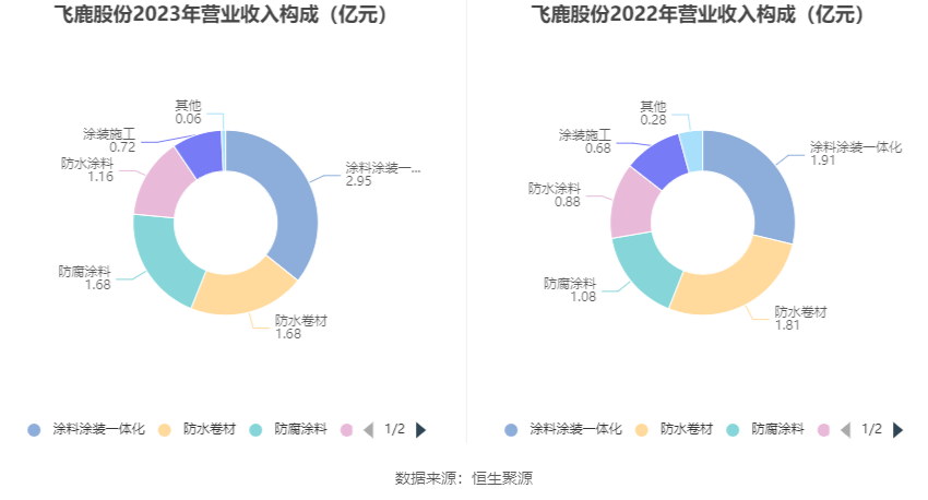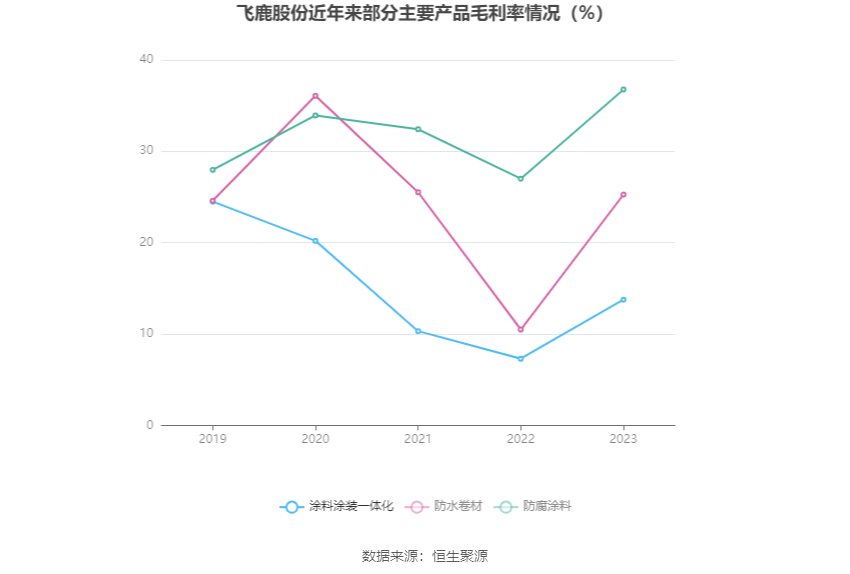 分产品看,涂料涂装一体化、防水卷材、防腐涂料2023年毛利率分别为13.76%、25.27%、36.78%。