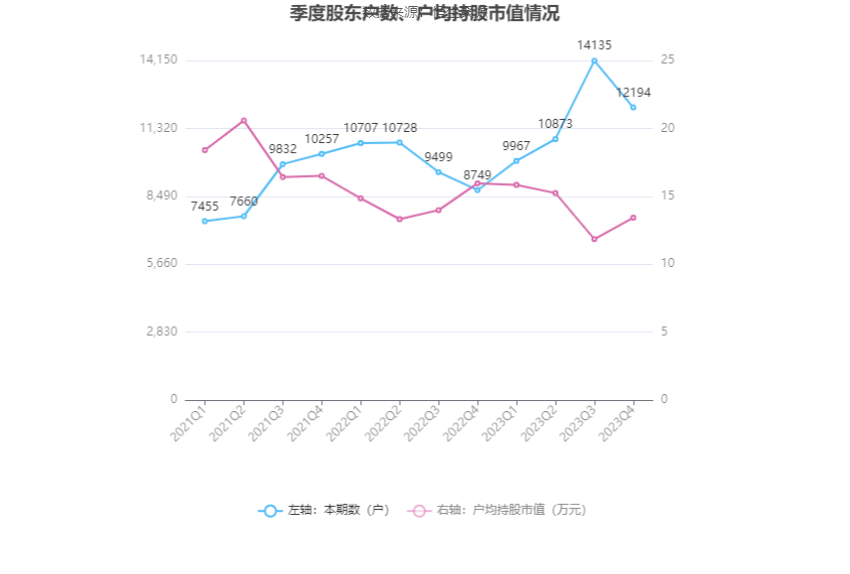 筹码集中度方面,截至2023年年末,公司股东总户数为1.22万户,较三季度末下降了1941户,降幅13.73%;户均持股市值由三季度末的11.85万元上升至13.43万元,增幅为13.33%。