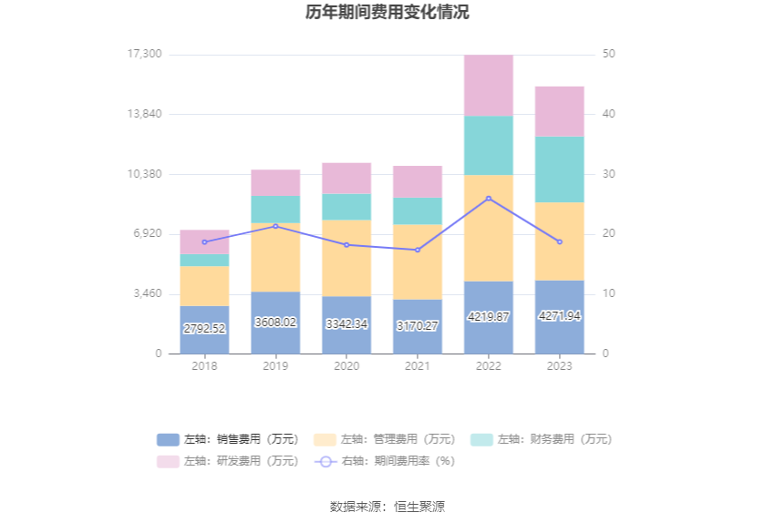2023年,公司期间费用为1.55亿元,较上年同期减少1818.59万元;期间费用率为18.75%,较上年同期下降7.27个百分点。其中,销售费用同比增长1.23%,管理费用同比下降26.62%,研发费用同比下降17.97%,财务费用同比增长11.45%。