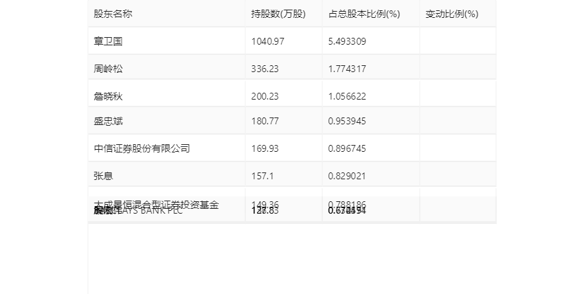 年报显示,2023年年末公司十大流通股东中,新进股东为BARCLAYS BANK PLC、殷宏伟,取代了三季度末的周宇光、中国国际金融香港资产管理有限公司-CICCFT10(R)。在具体持股比例上,中信证券股份有限公司持股有所上升,章卫国、周岭松、詹晓秋、盛忠斌、张息、大成景恒混合型证券投资基金、周刚持股有所下降。