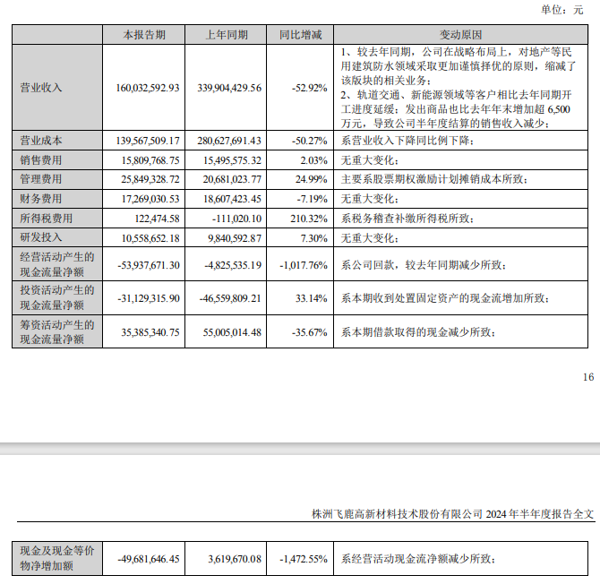 日前,飞鹿股份发布了2024上半年报告。报告期内飞鹿股份实现营收1.60亿元,同比下降52.92%,归属于上市公司股东净利润亏损4771万元,同比下降1272.73%。