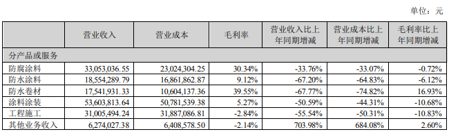 报告期内,飞鹿股份防腐涂料业务实现营收3305万元,同比下跌33.07%;防水涂料营收1255万元,同比下跌67.2%;防水卷材1754万元,同比下跌67.77%;涂料涂装业务营收5360万元,同比下降50.59%;工程施工业务营收3100万元,同比下跌55.54%。