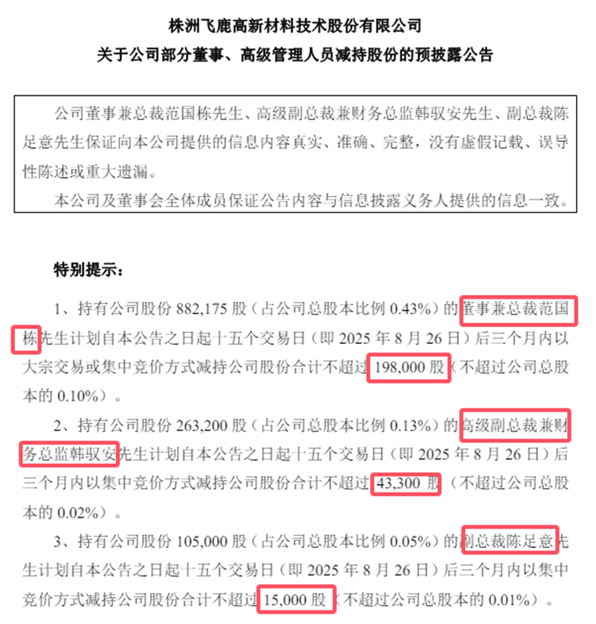8月4日飞鹿股份发布预减持公告,15天后,董事兼总裁范国栋将减持19.8万股、高级副总裁、财务总监韩双海将减持4.33万股、副总裁陈足意将减持1.5万股。按现在股价计算,核心管理层将套现300多万元。