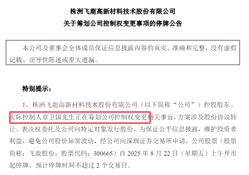 8月22日,飞鹿股份突发停牌公告,停牌原因是实控人章卫国筹划控制权变更,方案涉及股份协议转让+表决权委托+向特定对象发行股份。