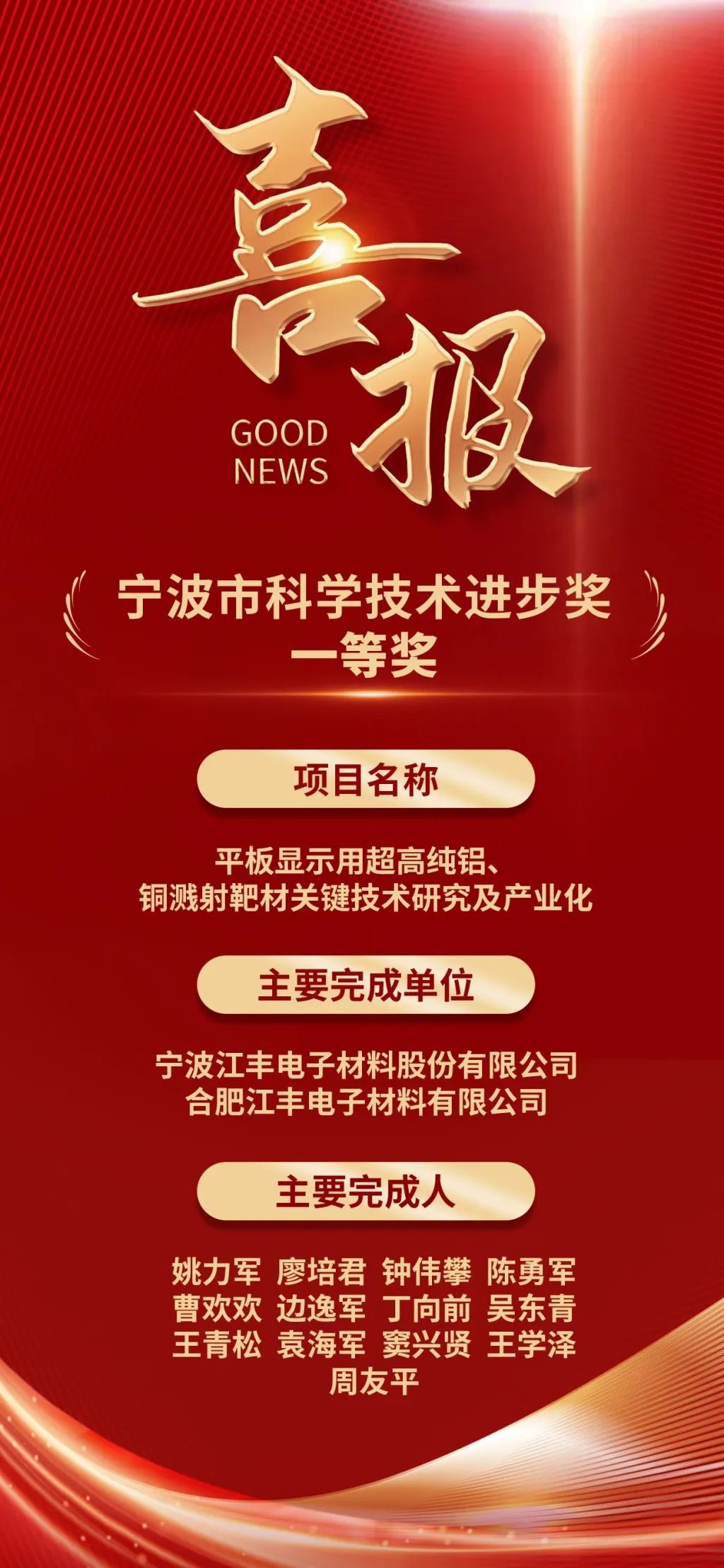 由江丰电子自主完成的“平板显示用超高纯铝、铜溅射靶材关键技术研究及产业化”项目取得宁波市科学技术进步奖一等奖,公司董事长兼首席技术官姚力军博士作为研发团队代表出席大会并上台领奖,彭佳学书记为获奖项目颁奖。