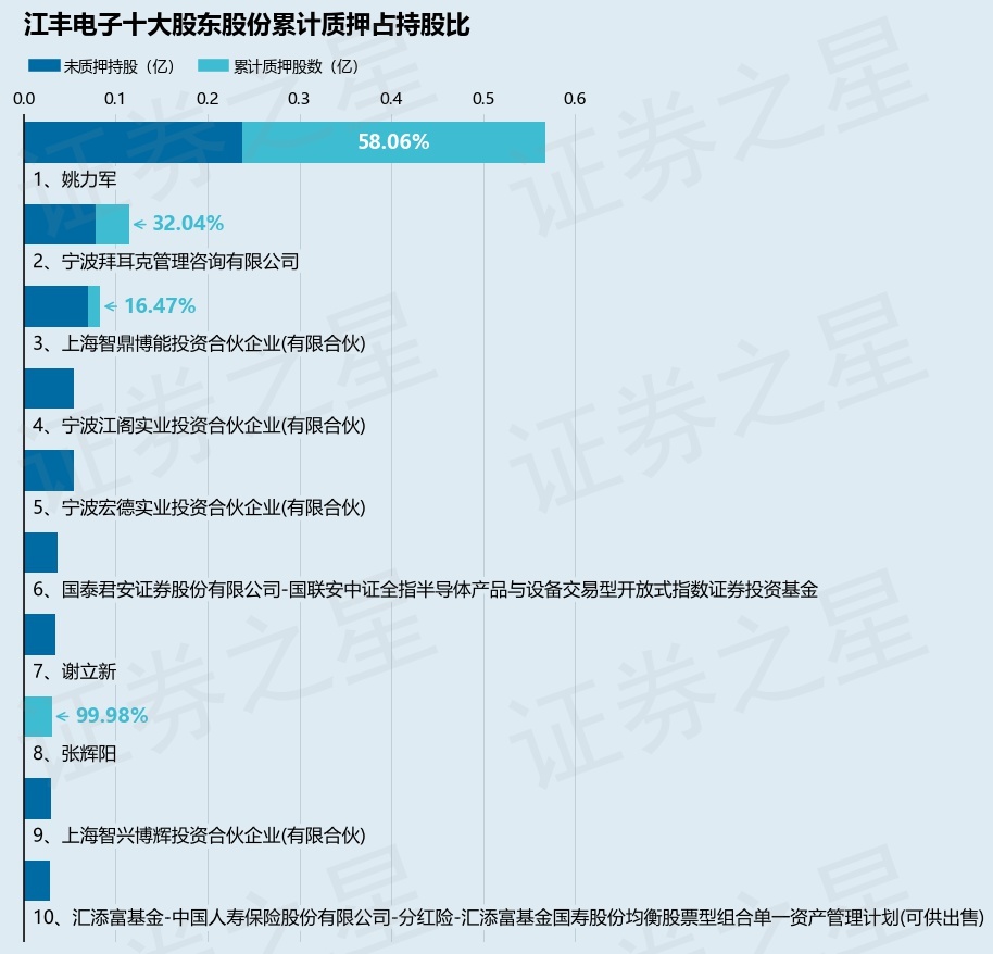截止本公告日,股东姚力军已累计质押股份3295.72万股,占其持股总数的58.06%,股东宁波拜耳克管理咨询有限公司已累计质押股份368.0万股,占其持股总数的32.04%,股东上海智鼎博能投资合伙企业(有限合伙)已累计质押股份137.4万股,占其持股总数的16.47%,股东张辉阳已累计质押股份307.66万股,占其持股总数的99.98%。本次质押后江丰电子十大股东的累计质押股份占持股比例见下图: