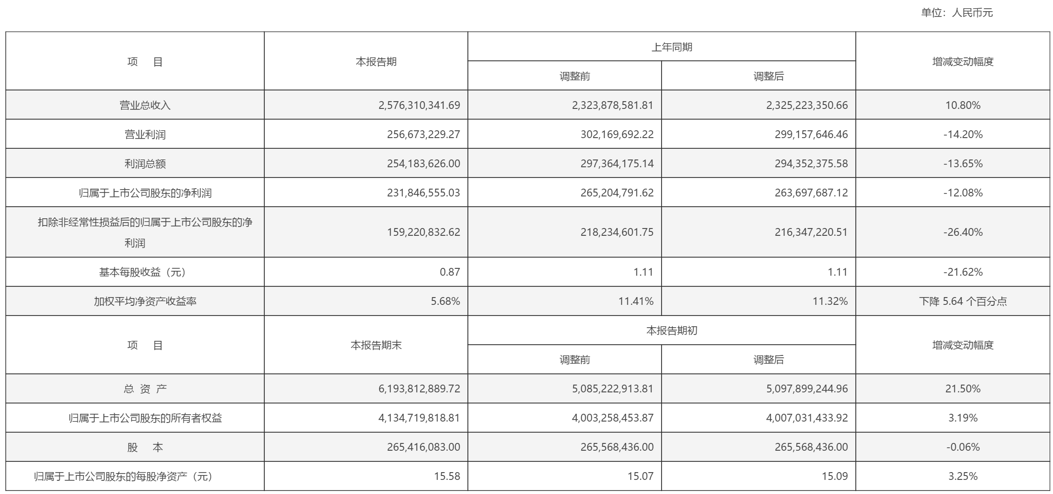 报告期末,公司总资产为619,381.29万元,较期初增长21.50%;股本26,541.61万元,较期初减少152,353元,下降0.06%;归属于上市公司股东的所有者权益413,471.98万元,较期初增长3.19%;归属于上市公司股东的每股净资产15.58元,较期初增长3.25%。报告期内公司股本变化主要系回购注销了部分第二期股权激励计划限制性股票。