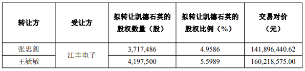 同时,江丰电子与转让方约定,张忠恕、张凯轩、德益诚及英凯石英同意放弃其持有的凯德石英全部剩余股份14,820,283股(占凯德石英总股本19.7683%)的表决权,放弃期限至转让方及其一致行动人合计所持有的凯德石英股份比例低于凯德石英总股本5%之日为止。