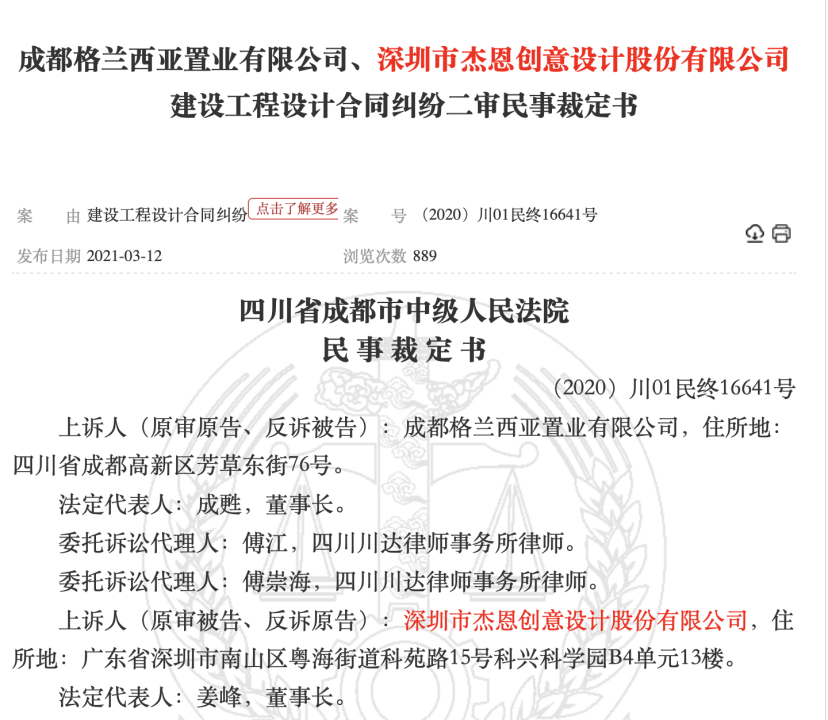 乐居财经注意到,杰恩设计先前曾多次卷入与成都格兰西亚置业的建设工程设计合同纠纷案件中。事件起因是2018年9月,格兰公司曾作为甲方,委托杰恩设计负责四川省成都市高新区交子大道33号的中国华商金融中心商业项目室内设计。并于当年10月向对方转款97.407万元作为定金。