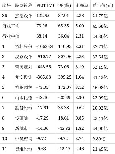 从行业市盈率排名来看,公司所处的工程咨询服务行业市盈率平均73.96倍,行业中值38.14倍,杰恩设计排名第36位。