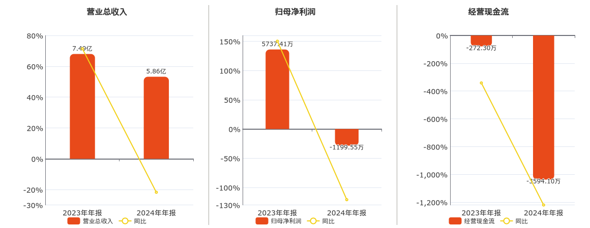 公司营业总收入为5.86亿元,在已披露的同业公司中排名第15,较去年同报告期营业总收入减少1.63亿元,同比较去年同期下降21.74%。归母净利润为-1199.55万元,在已披露的同业公司中排名第18,较去年同报告期归母净利润减少6936.96万元,同比较去年同期下降120.91%。经营活动现金净流入为-3594.10万元,在已披露的同业公司中排名第22,较去年同报告期经营活动现金净流入减少3321.79万元。