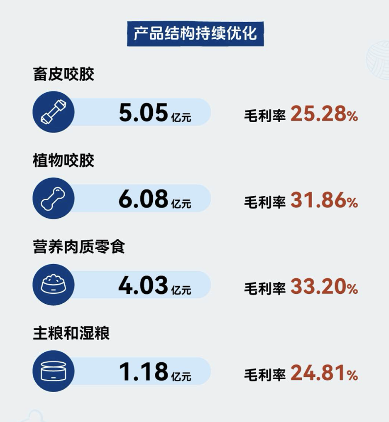 报告期内,主营业务销售收入大部分来自宠物零食产品。其中,畜皮咬胶和植物咬胶的合计营收达11.13亿元,占公司营收的比重达67.03%,毛利率分别是25.28%、31.86%,体现了公司在咬胶业务领域的强势与盈利能力。