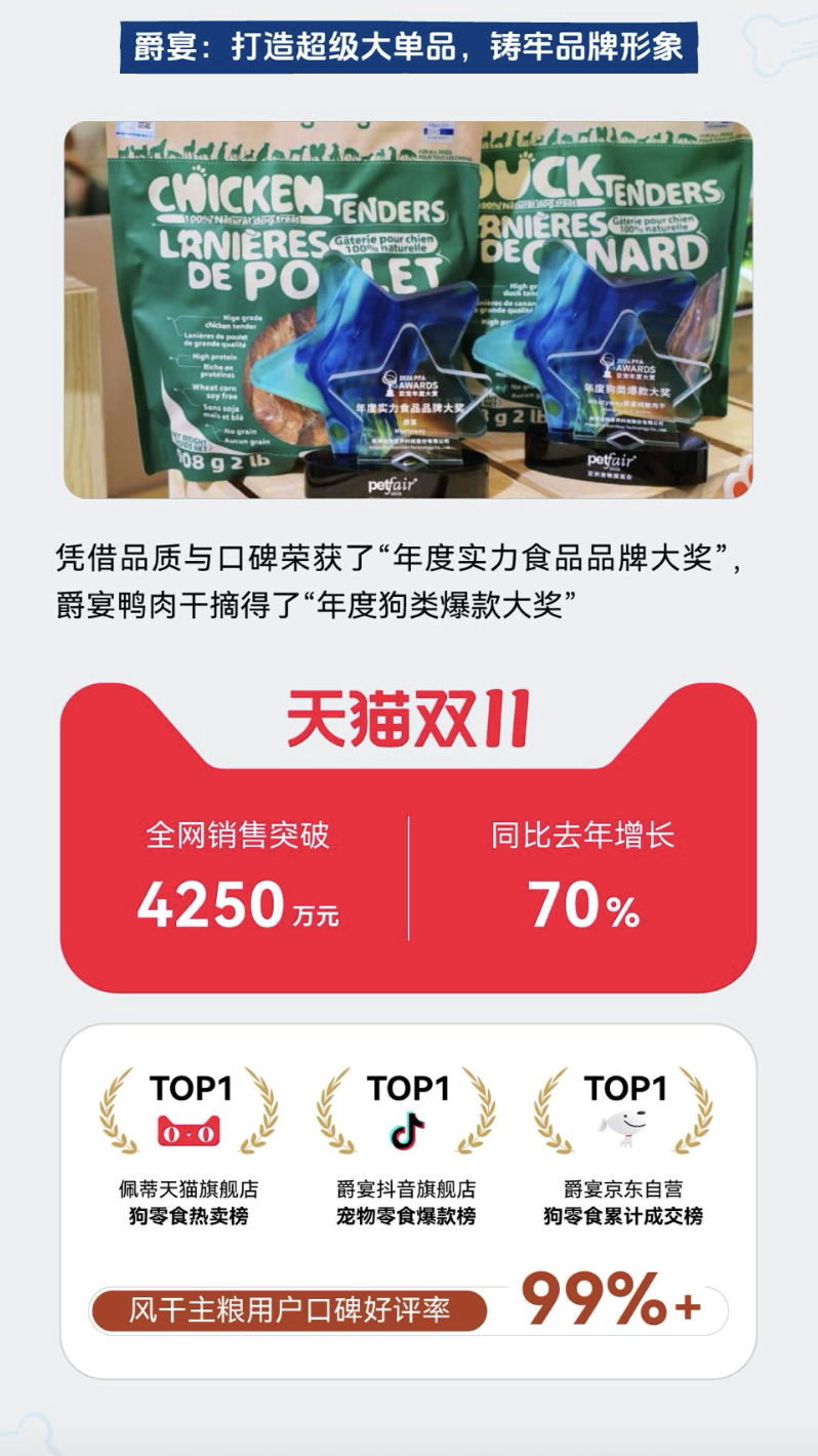 去年,爵宴在天猫双11狂欢节中,全网销售额突破4250万元,同比增长70%,稳居天猫、抖音、京东三大平台细分榜单TOP1,风干粮用户口碑好评率99%+。