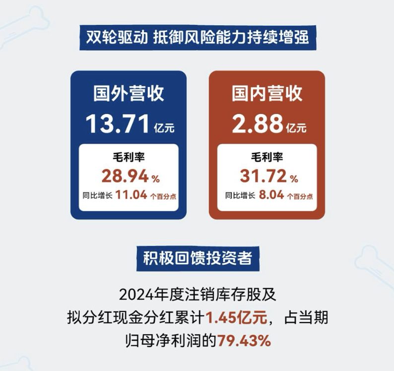 此外,公司还在营养肉质零食、宠物主粮和湿粮等领域进行了积极布局且成效显著。2024年,营养肉质零食营收为4.03亿元,毛利率33.20%。主粮和湿粮的高端化趋势也在增强,产品升级特征明显,总营收1.18亿元,毛利率为24.81%,体现了高端化定位的溢价能力。
