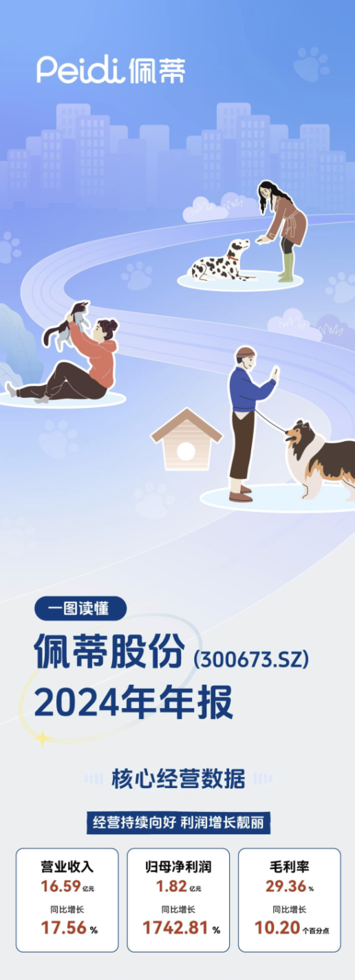 近日,佩蒂股份发布2024年财报,公司全年实现营业收入16.59亿元,同比增长17.56%;归母净利润达1.82亿元,同比大幅增长1742.81%,创历史新高。综合毛利率提升至29.36%,同比增加10.20个百分点。