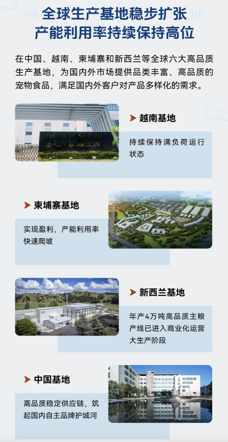 作为我国宠物行业最早实施“走出去”发展和国际化运营的企业之一,公司全球化产能布局持续完善,目前在中国、新西兰、越南、柬埔寨等国家建立多个一流生产基地,为全球主要市场提供不同品类的宠物食品。