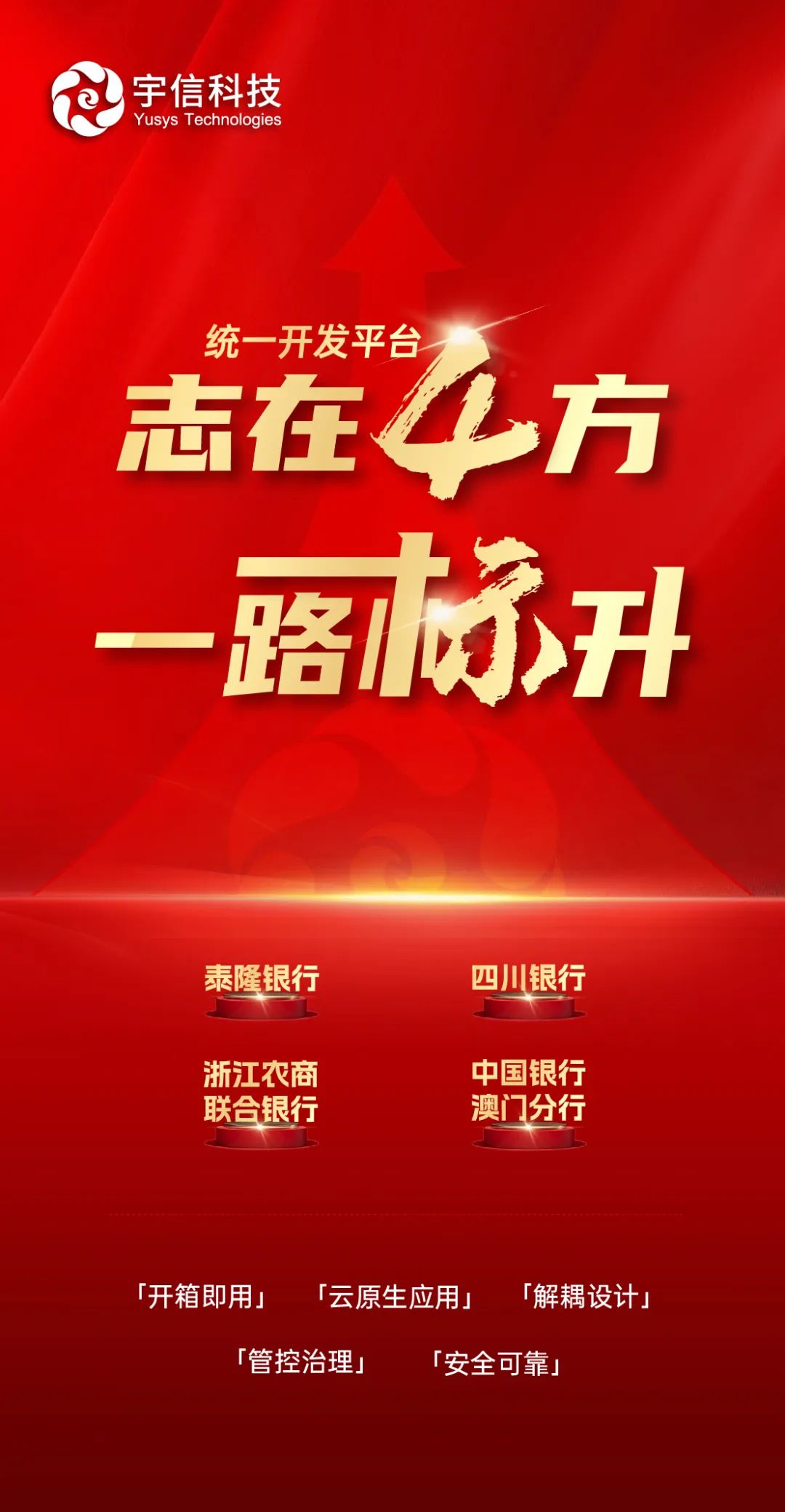 近日,作为宇信科技技术底座平台的重要产品,统一开发平台凭借更高的易用性、安全性、灵活性、成熟性等优势,在市场竞争中表现强劲,接连斩获泰隆银行、四川银行、浙江农商联合银行、中国银行澳门分行的订单。