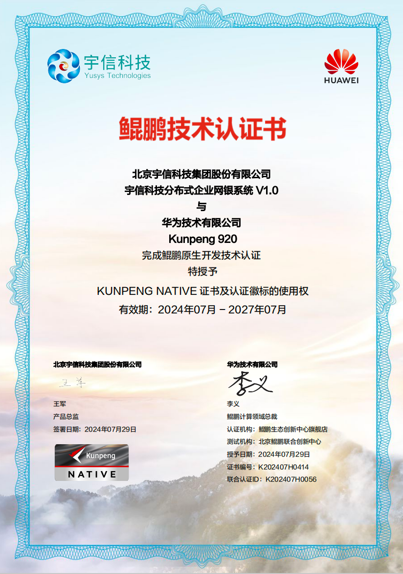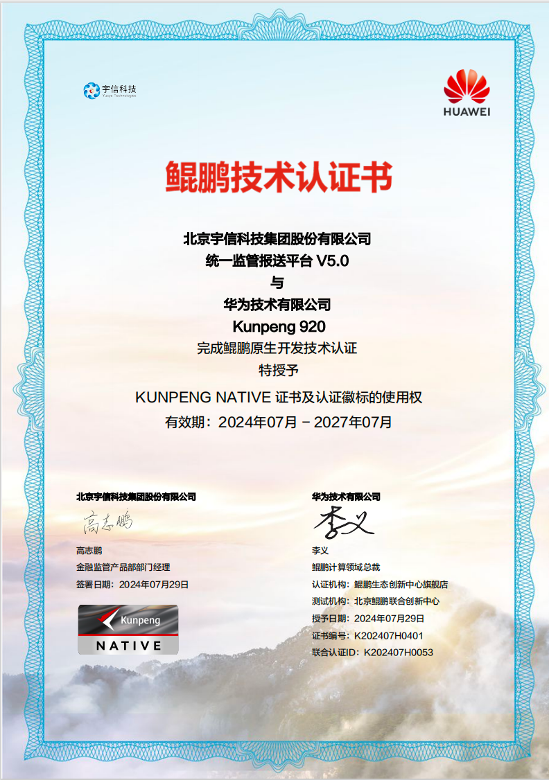 近日,宇信科技统一监管报送平台、分布式企业网银系统、远程经营服务平台等三款产品成功获得鲲鹏原生开发认证。这是宇信科技与鲲鹏自2月正式开启原生应用开发合作以来,双方携手落地的首批成果,也是双方优势互补,通过科技创新推动金融数字化转型的重要落地实践。