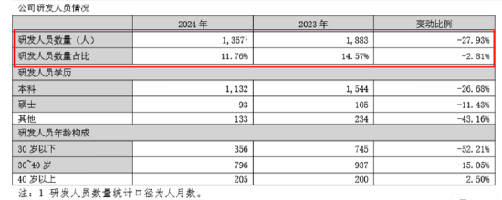 另外,据公司披露的研发人员情况可以看出,截至2024年末,公司研发人员数量已减至1357人,较2023年减少526人,同比下降27.93%。