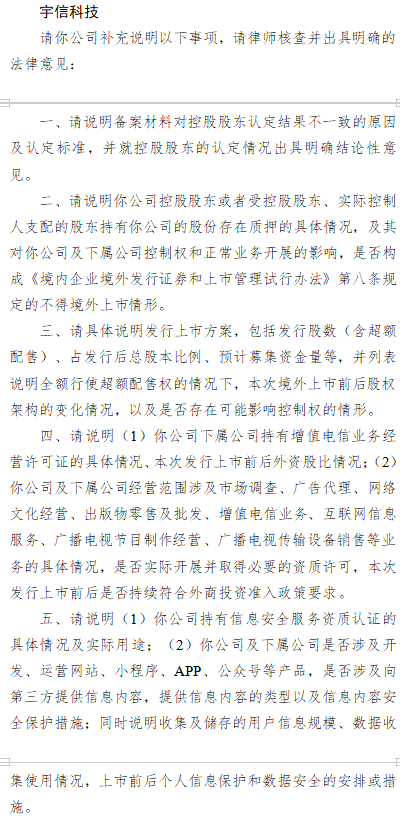 近日,宇信科技收到证监会关于本次境外上市的备案反馈意见,具体反馈如下: