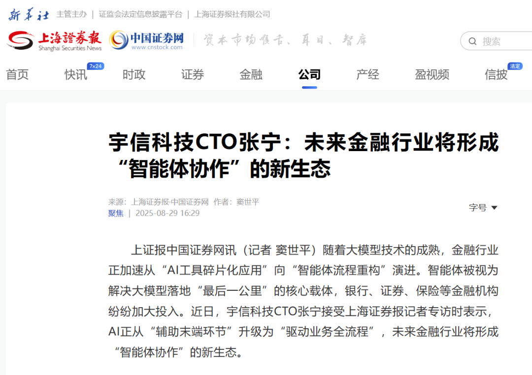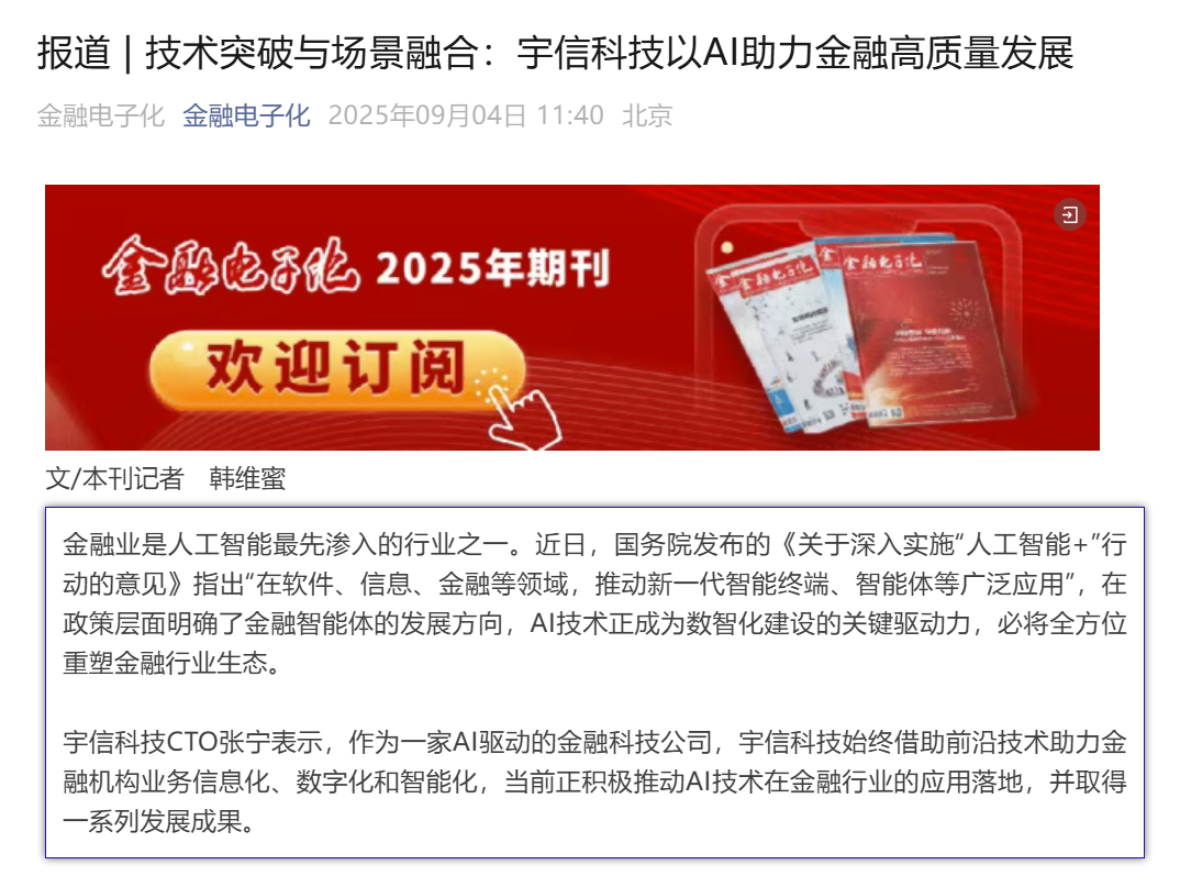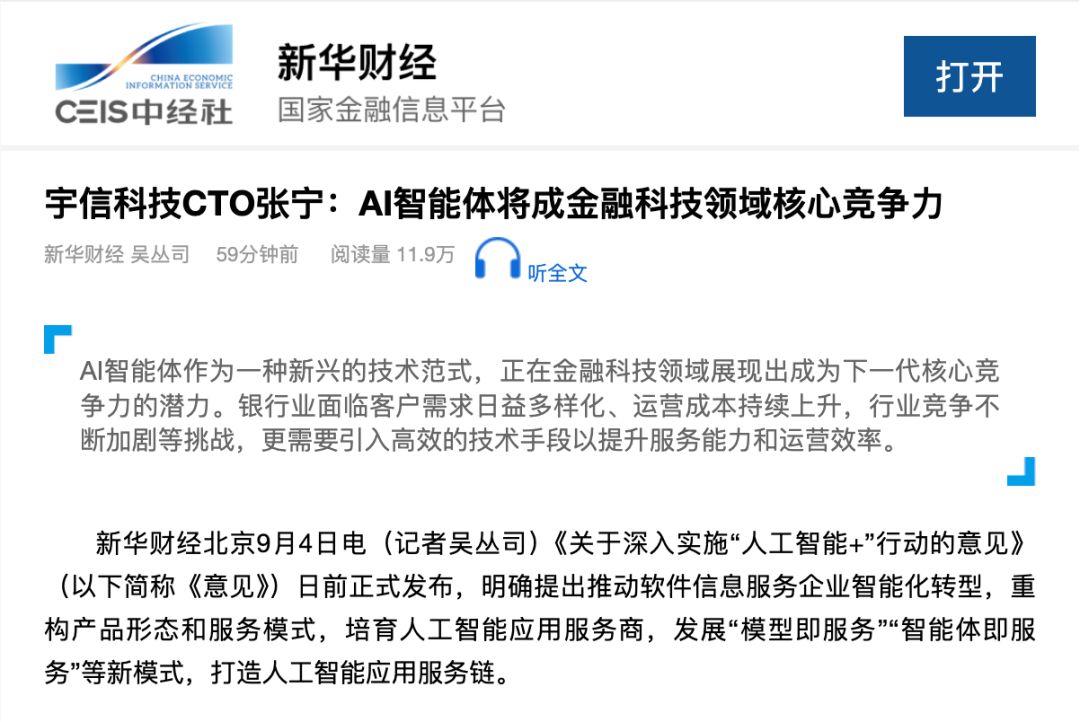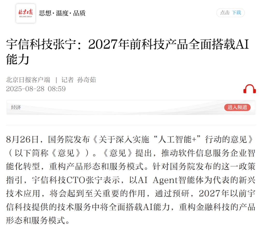 几乎在同时,8月26日,国务院发布《关于深入实施“人工智能+”行动的意见》(以下简称《意见》)。《意见》提出,推动软件信息服务企业智能化转型,重构产品形态和服务模式。培育人工智能应用服务商,发展“模型即服务”、“智能体即服务”等,打造人工智能应用服务链。针对国务院发布的这一政策指引,张宁表示,以AI Agent智能体为代表的新兴技术应用,将会起到至关重要的作用,通过预研,2027年以前宇信科技提供的技术服务中将全面搭载AI能力,重构金融科技的产品形态和服务模式。