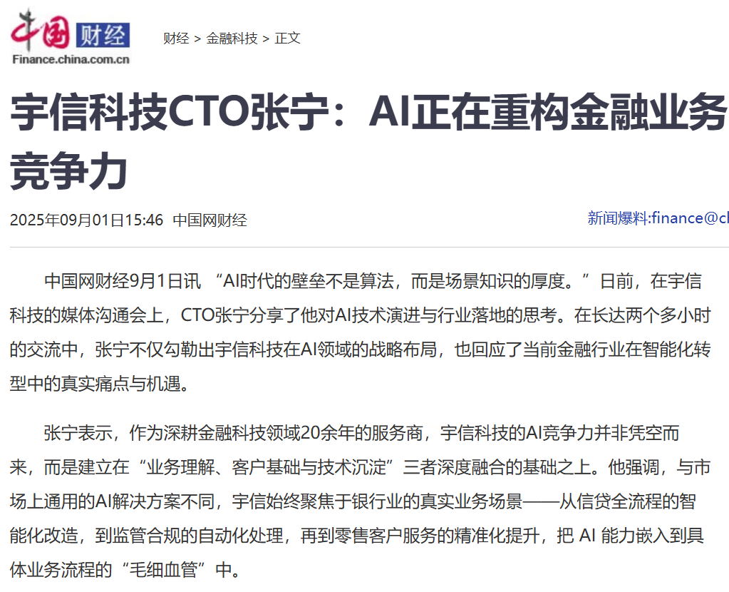 日前,由宇信科技发起组织的“走进宇信,与‘信’同行”媒体交流会在北京总部举办。由新华财经、北京日报、金融电子化、中国银行保险报、中国网、上海证券报、经济观察报七家国内专业媒体组成的观察团,同宇信科技CTO张宁进行了一场关于AI技术和金融业务深度融合的行业研讨与思想碰撞。