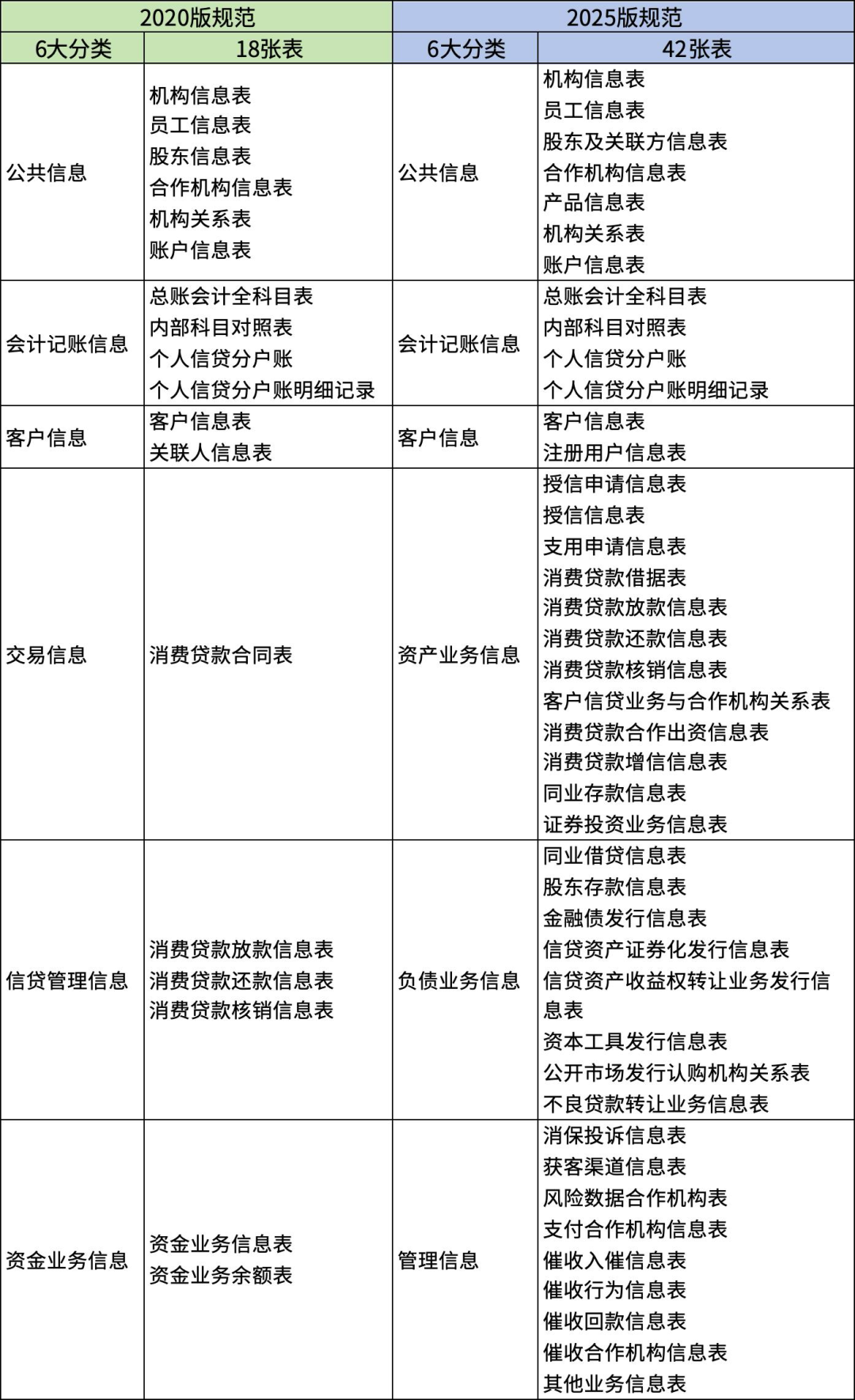 《2020版规范》包含6大主题域、18张数据表、共计276个数据项;《2025版规范》仍维持6大主题分类,但对内容结构进行了显著优化与扩充,调整至42张数据表、854个字段,更全面覆盖消费金融业务全流程。主要调整包括: